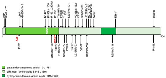 From a genetic point of view, NLSDM was recently recognized and, even among experts, its clinical, genetic, and metabolic implications are yet to be completely elucidated [30,38]. PNPLA2 gene mutations cause the onset of NLSDM. PNPLA2 encodes for the protein adipose triglyceride lipase (ATGL). The human ATGL protein comprises 504 amino acids and contains a patatin domain located within the NH2-terminal region of the protein (Figure 1). The active site is characterized by a catalytic dyad (amino acid residues Ser47 and Asp166), within the patatin domain. The COOH-terminal region of ATGL contains a hydrophobic stretch (315–360 residues) required for binding to LDs. This enzyme catalyzes the first step in the hydrolysis of TAG, generating free FAs and diacylglycerol. Fifty-five patients were clinically and genetically characterized worldwide. The 39 different ATGL mutations reported differently affect protein function or production; 25 of the 39 (64%) result in truncated proteins (stop codon, frameshift, and splice site mutations), one is expected to abrogate protein expression, and the remaining 13 (33%) are missense mutations (Figure 1) [39,40,41,42,43,44,45,46,47,48,49,50,51,52].