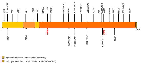 Domain organization of the α-β hydrolase domain 5 (ABHD5) protein, and variations associated with NLSD with ichthyosis (NLSDI). ABHD5 comprises 349 amino acids, characterized by an LD-binding site (hydrophobic domain) and an α/β hydrolase domain that includes two residues involved in ATGL and perilipin interaction (Q130 and E260). All ABHD5 mutations are shown based on recommendations for sequence variant description of HGVS-nomenclature website. Five variations (g.43728907_43732862del3955ins26, c.135 - 2A > G; c.506 - 3C > G; c.507-1G > A; IVS6 + 6A > T), that alter or abrogate RNA expression are not shown in the scheme.