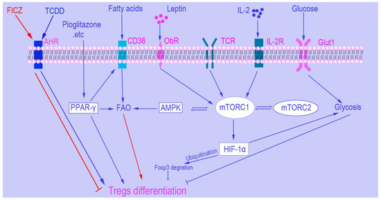 Metabolic and mTOR signaling control of Regulatory T cells’ differentiation. Different ligand binding with aryl hydrocarbon receptor (AHR) leads to dissimilar outcome in Tregs induction. For example, 6-formylindolo [3,2-b] carbazole (FICZ) binding with AHR inhibits Tregs generation while 2,3,7,8-tetrachlorodibenzo-p-dioxin (TCDD) promotes Tregs generation. Peroxisome proliferator-activated receptor-γ (PPAR-γ) increase Tregs differentiation via regulating the balance between fatty-acid oxidation (FAO) and glycometabolism. AMP-activated protein kinase (AMPK) is an important metabolic checkpoint in Tregs differentiation, and there is controversy regarding the role of the AMPK in Tregs differentiation. mTOR signaling is the most important metabolic regulator of Tregs. If mTOR is absent in naïve CD4+ T cells, it can dramatically increase Tregs differentiation even under normal activating conditions. HIF1α does not directly regulate the expression of Foxp3. However, it promotes the degradation of Foxp3 protein by ubiquitination.