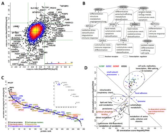 Characterization of the proteome and secretome of highly differentiated HepaRG cells cultivated in defined serum-free medium (0.5% DMSO) supplemented with growth factors. (A) Protein copy numbers per cell in HepaRG and HepG2 cells versus PHH (see also Tables S4–5 and Figure S4). (B) Master regulators (in grey when not detected) of the hepatic phenotype and the main functions associated with their main (downstream) related factors (see details in Figure S3). (C) Secretion rates of the 272 proteins secreted by HepaRG cells. * Extrapolated values for albumin (ALB) after immunodepletion (see the Methods section and Table S5). (D) 2D annotation enrichment from 3995 proteins identified in at least two of the three cell types (see also Figure S2 and Table S6).