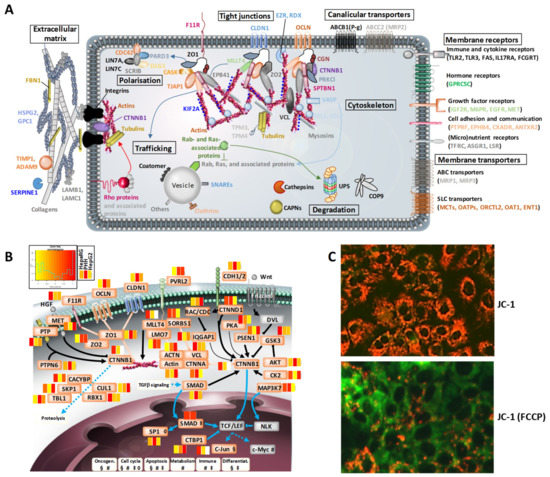 ii) Cell–cell communications and polarity. Proteins forming or that are associated with tight junctions involve the receptor CXADR and cytosolic protein cingulin (CGN), which are linked to the tight junction protein ZO-1, as well as Claudins, MAGUK proteins, and receptor-type tyrosine-protein phosphatase F (PTPRF). Among these proteins, CGN is detected in HepaRG, and not in HepG2 cells; it is essential for the formation and regulation of the tight junction paracellular permeability barrier, and for the delineation of the biliary pole [40]. This function is crucial, and as suggested here, it is effective in HepaRG. Meanwhile, a number of proteins involved in cell adhesion, adherens and tight junctions (e.g., desmoplakin, galectin 4, occludin), and in the polarized organization of the actin fiber network (e.g., plastin 2, MYL12A) were seen to be less abundant in HepaRG cells than PHH (see Table S5). By ensuring the maintenance of plasticity and motility in differentiated HepaRG cells, this may favor their ability to transdifferentiate, i.e., to maintain stemness properties and/or a pool of early progenitor cells in parallel to the differentiation process [10].