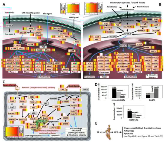 Because apoptosis is essential for the maintenance of liver homeostasis, we compared the abundance of apoptotic factors in the three cell systems (Figure 4C). Overall, HepaRG cells and PHH were quite close, while HepG2 appeared less well-equipped. For example, regarding the extrinsic (receptor-mediated) apoptotic pathway, the tumor necrosis factor receptor FAS was more abundant in HepaRG than in HepG2 cells, and FAS-associated death domain protein (FADD) was not detected in HepG2. Concerning the intrinsic (mitochondria-mediated) apoptotic pathway, the abundances of the most important apoptosis-inducing (AIFM1, BAX, BAK1, BID, APAF1) or -inhibiting (BCL2L1, BID, APAF1) factors in HepaRG were well-balanced and roughly similar to those in PHH (no more than 2–5 times lower or higher; see Table S5B). Finally, for the executing enzymes, caspase 9 (CASP9) was only detected in HepaRG cells, and the caspase 3 (CASP3) expression level was relatively close in the three cell systems. We next explored the contribution of GSTs to apoptosis regulation via caspase 3 inhibition as a functional hotspot of hepatocytes [54]. We noticed that the abundance of cytosolic glutathione-S-transferases (GSTT2B, GSTT1, GSTO1, GSTM4, GSTM3, GSTA1/A2) and caspase 3 (CASP3) globally followed an inverse ‘copy number gradient’ in the three cell models, suggesting that their interrelationship in HepaRG cells would better reflect the actual situation in PHH than that in the HepG2 cells (Figure 4D). Additionally, the liver-specific form of GSTA1 was the most abundant GST isoform, exhibiting levels that were 1.6- and 5.8 times lower in HepaRG and HepG2, respectively, versus PHH cells. Finally, proteins of the unfolded protein response (UPR) were well-expressed in HepaRG cells (Figure 4E), showing that these cells hold potential for studying the underlying mechanisms of endoplasmic reticulum (ER) stress, which extends the findings of our previous study [55]. For example, HSP90B1 (endoplasmin) and HSPH1 are well-detected in HepaRG, but absent from HepG2 data, and the 15 HSPs that were detected in all three cell systems displayed copy numbers that were generally closer between the HepaRG cells and PHH (see Table S5).