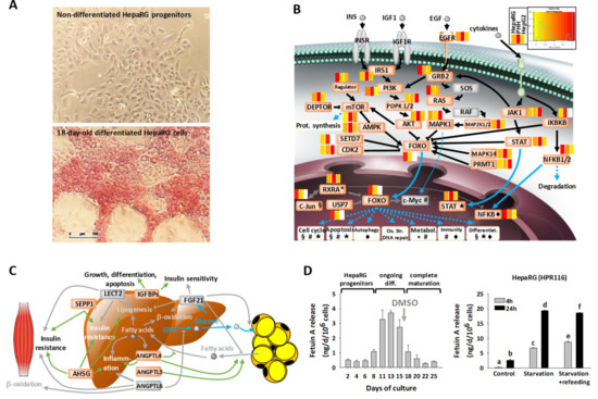 Metabolic pathways expressed by highly differentiated HepaRG cells. (A) Periodic acid-Schiff staining showing glycogen storage in 18-day-old differentiated HepaRG cells (differentiation medium: 1.7% DMSO, 10% FCS) but not in undifferentiated progenitor cells. (B) Relative differences of protein abundances in HepaRG cells (defined serum-free medium: 0.5% DMSO, growth factor supplementation) and in HepG2 cells versus PHH, shown as heatmaps for the factors of the FOXO signaling pathway (white boxes: proteins not seen). Non-detected proteins are colored in grey. See also Table S5. (C) Major hepatokines (in orange) identified in the secretome of HepaRG cells (defined serum-free medium). See also Table S5. (D) Release of Fetuin A by HepaRG cells maintained in the differentiation medium at different states of differentiation (diff.), and in response to 24 hr of fasting, and refeeding for 16 hr with palmitate (means ± SEM of three determinations). Superscript letters indicate significantly different values (analysis of variance (ANOVA) and post hoc Tukey tests; p < 0.05).