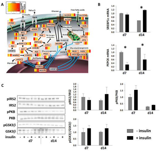The comparison of abundances of proteins involved in insulin signaling/resistance pathways in cell lines versus PHH was at the advantage of the HepaRG cells, with a higher number of proteins being detected, and levels being generally close to those in PHH (Figure 7A). Various transporters for glucose (e.g., SLC2A1 and SLC2A2) and fatty acids (e.g., SLC27A5) were detected in HepaRG cells, while SLC2A2 and SLC27A5 were not seen in HepG2 (Table S5). This suggests that the uptake of substrates is very active in HepaRG cells. We already mentioned above that enzymes of lipogenesis and carbohydrate metabolism are also well-expressed in HepaRG cells (Figure 2D, Tables S5–S6 and Figures S2 and S5). This is in line with the fact that steatosis is induced in differentiated HepaRG cells exposed to various fatty acids [56]. Moreover, components of the insulin signaling pathway were well expressed in HepaRG cells (Figure 7A), at levels that are generally close to those in PHH (IRS1 and IRS2, PIK3R1 or PI3K, and PDPK1/2). Factors like IKBKB, FOXO1 and the limiting phosphoenolpyruvate carboxykinase enzymes (PCK2 and PCK1) were also well-detected in both HepaRG and PHH cells, while they were not present in HepG2 data. Additionally, components of the glucagon signaling pathway also appeared to be well-represented in the proteome of HepaRG cells (see Table S5), with, for example, the cyclis AMP (cAMP)-dependent protein kinase catalytic subunit beta (PRKACB) being 10 times more abundant in HepaRG than PHH cells, while not detected in HepG2. Overall, these data suggest that HepaRG cells should properly respond to insulin and glucagon. In a 6 hr insulin stimulation assay, we confirmed that the expected hepatic transcriptional response to insulin was observed for two key hepatic insulin responsive genes, namely SREBF1 (or SREBP-1c) and PCK1 (or PEPCK). Upon stimulation (Figure 7B), mRNA levels of SREBF1 and PCK1 were indeed increased and decreased, respectively, reflecting increased lipogenesis and inhibited gluconeogenesis. We thereafter validated short-term insulin response in the HepaRG model, showing that the phosphorylation status of IRS2, PKB and GSK3β tended to increase after 15 min of insulin stimulation (Figure 7C), as expected. The increase nevertheless remained moderate (<2 times), which might be linked to the fact that cells were grown in an insulin-rich medium. Insulin deprivation (overnight) prior to assays was thus not sufficient to reset basal insulin stimulation. Moreover, basal phosphorylation of PKB exhibited a decrease from day 7 to day 14, indicating that the differentiation state of HepaRG cells keeps enhancing over time. Although experimental conditions (e.g., culture medium, dose response assessment) have to be improved, HepaRG cells nevertheless appear as a very good model for studying liver disease mechanisms that are related to insulin signaling/resistance.