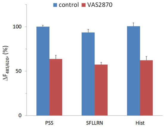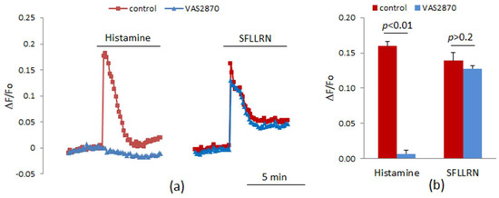 The influence of VAS2870 (10 µM) on calcium signaling in response to histamine (10 μM) and agonist of PAR1 SFLLRN (2 µg/mL). (a) The curves represent the data of one of three experiments with similar results; (b) The bars represent the mean values of [Ca2+]i increase in three independent experiments. [Ca2+]i was measured as a relative increase in CalciumGreen fluorescence. In control experiments, the vehicle, dimethylsulfoxide (DMSO) at a final concentration 0.1%, was added instead of VAS2870.