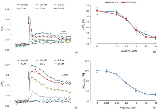 We studied the effect of VAS2870 on [Ca2+]i elevation induced by histamine. At a concentration of 10 μM, VAS2870 almost completely suppressed the calcium signal of 1 mM histamine, while there was no significant inhibition of the action of PAR1 agonist SFLLRN (Figure 1). The effect of VAS2870 was not competitive toward histamine, since wat is observed at a low concentration of VAS2870, which is two orders of magnitude lower than the concentration of histamine. We determined the concentration-dependence curves for the inhibition by VAS2870 of [Ca2+]i elevation at different histamine concentrations (Figure 2c). The IC50 for VAS2870 calculated from these data was 3.64 and 3.22 μM at 1 and 100 μM concentrations of histamine, respectively. These results suggest the existence of a specific mechanism of histamine-induced [Ca2+]i mobilization in HUVECs. The following data provide evidence in favor of this conclusion. It has been shown that two-pore channels activated by NAADP are involved in histamine-induced [Ca2+]i mobilization in HUVEC via H1 receptors, while calcium signaling of thrombin is independent from NAADP [40,41].