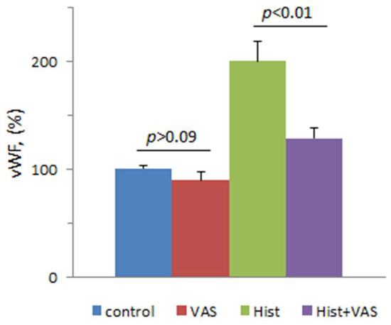 The next task was to study how VAS2870 can affect physiological reactions of ECs activated by histamine, which causes secretion of vWF in HUVECs due to the activation of H1 receptors. This secretion is mediated by the elevation of cytoplasmic calcium ion concentration [40,51]. We showed that, in the presence of VAS2870, the effect of histamine on vWF secretion was attenuated, though VAS2870 did not inhibit the basal secretion of vWF (Figure 4). This result correlates with our data on the inhibition of histamine’s effect on [Ca2+]i by VAS2870.