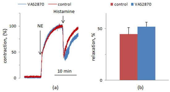 Relaxation of rat aortic rings preconstricted by norepinephrine (NE) in response to 100 μM histamine in the absence and presence of VAS2870. VAS2870 at a concentration of 10 μM or vehicle was added to the rings 30 min or 1 h before NE. (a) Typical curves of the contraction and relaxation. (b) The degrees of relaxation in the absence and presence of VAS2870 (n = 10 for control and for VAS2870 from five independent experiments). In each experiment there were measurements from two control and two experimental aortic rings.
