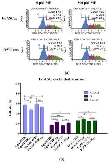 The influence of metformin on the distribution of EqASCs during the cell cycle, with representative histograms (a) and results of statistical analysis (b). The statistically significant changes are indicated with asterisks; * p < 0.05; ** p < 0.01 and *** p < 0.001. Non-significant differences are marked as ns.