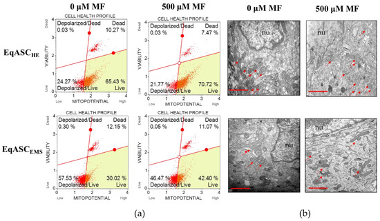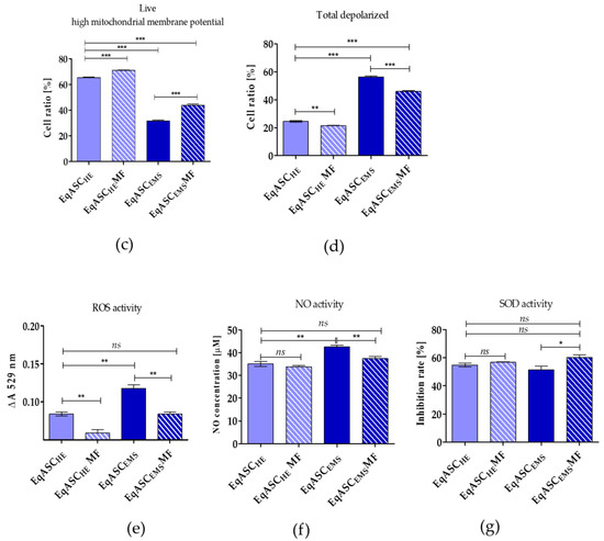 The influence of metformin on mitochondrial membrane potential and oxidative. Representative dot plots indicating distribution of cells accordingly to the mitochondrial membrane potential (a). The ultrastructure of EqASCHE and EqASCEMS without metformin treatment and after metformin treatment. Mitochondria are indicated with red arrows, and nuclei with nu symbol, scale bar: 2 μm (b). Analysis of cell viability based on mitochondrial potential (c). Comparison of total depolarised cells in tested experiments (d). Evaluation of reactive oxygen species (e), nitric oxide (f) and superoxide dismutase activity (g). Significant changes are indicated with asterisks: * p < 0.05; ** p < 0.01 and *** p < 0.001, while non-significant differences are marked as ns.