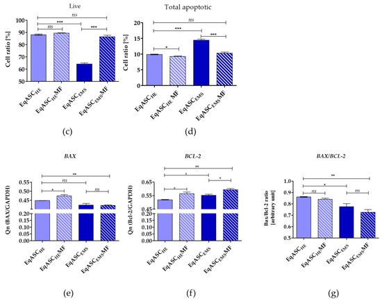 Quantification of apoptosis and necrosis by annexin V binding and propidium iodide uptake revealed that metformin exerts an anti-apoptotic effect on EqASCEMS cultures (Figure 4a). The cellular viability of EqASCEMS was significantly restored following metformin treatment. The percentage of early and late apoptotic cells decreased after metformin administration, not only in EqASCEMS but also in EqASCHE (Figure 4c,d). Additionally, the viable cells were visualised with calcein-AM staining, while dead cells were counterstained with propidium iodide. The images confirmed the previous observations that metformin increases confluency of EqASCs in cultures. Nevertheless, based on the pictures, it was difficult to ascertain the influence of metformin on cells viability, because dead cells were dimly fluorescent in analysed cultures (Figure 4b). The anti-apoptotic effect of metformin towards EqASCs was confirmed using RT-qPCR. We determined that metformin decreases mRNA expression of BAX in EqASCEMS cultures, while increasing the mRNA expression of anti-apoptotic BCL-2. Further, the BAX transcript level increased following metformin treatment in EqASCHE cultures, however, the BAX/BCL-2 ratio decreased, indicating an anti-apoptotic effect correlating with low ROS activity in those cultures (Figure 4e–g).