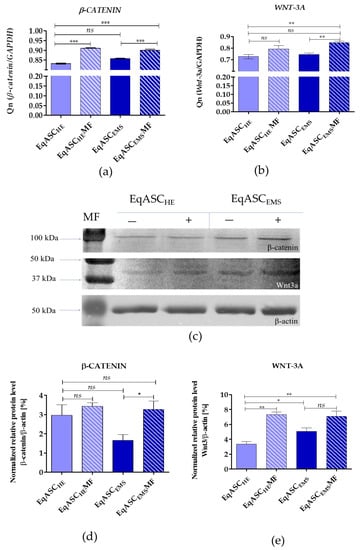 Determination of Wnt-3/β-catenin expression (a,b) and corresponding intracellular accumulation of protein (c–e). Statistically significant changes are indicated with asterisks: * p < 0.05; ** p < 0.01 and *** p < 0.001, while non-significant differences are marked as ns.