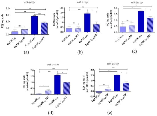 miRNA expression measured with two-tailed RT-qPCR. The following miRNAs were tested: miR-16-5p (a), miR-21-5p (b), miR-29a-3p(c), miR-140-3p (d) and miR-145-5p (e). Data are normalised to U6 snRNA levels and expressed as fold changes compared to the sample with the lowest level. Statistically significant changes are indicated with asterisks: * p < 0.05; ** p < 0.01 and *** p < 0.001, while non-significant differences are marked as ns.