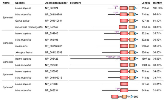 Ephexins function as GEFs for Rac, Cdc42, Rho and RhoG, and interact with Eph receptors to transduce signals from the receptors although an Eph receptor interacting with Ephexin2 has not been identified. Accordingly, they are engaged in a variety of Eph receptor-mediated cellular processes (Figure 2 and Table 1) [18,19,20,21,22]. In addition, the domain structure of Ephexins is highly conserved, which consists of a tandem DH-PH domain followed by a SH3 domain, but the length of their N-termini is irregular and the sequence identity is especially low among Ephexin1 orthologs, particularly drosophila and chicken Ephexin1 (dEpehxin1 and cEphexin1) (Figure 3). In the following sections, the members of the Ephexin family will be consecutively discussed in detail (also refer to the Table S1 to see all experimental systems for studies on Ephexins).