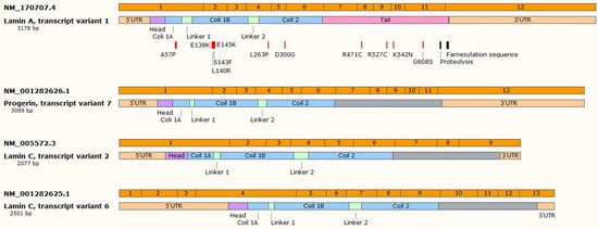 The progeroid laminopathies (or MADA phenotypes) are associated with other mutations than “classical”. Mutations identified so far, beyond any doubts, are missense mutations affecting the head domain (P4R) coil 1B (e.g., A57P, L59R, E138K, L140R, S143F, E145K, or similar) [28,29], one spot in coil 2 and several spots in the tail region (R471C, R527C/H, K542N, S573L, G608S) (Figure 1) [14,16,17]. Most of such mutations result in a more complex phenotype which partly overlaps with other laminopathies such as FPLD2, DCM, EDMD2, or a mixture of them [18,30].