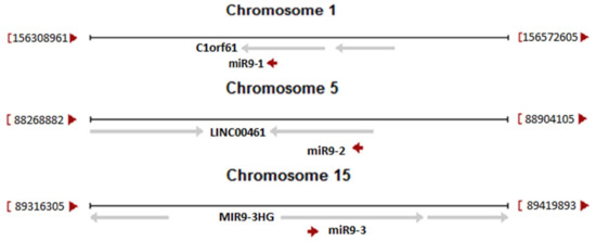 Pre-miR-9-1, pre-miR-9-2 and pre-miR-9-3 localization in human genome (red arrows). Some of host genes are also indicated (gray arrows). From C1orf61 27 transcripts could be transcribed; 6 of them are protein-coding, 15 of them contain pre-miR-9-1 sequence. LINC00461 codes 16 non-protein coding transcripts; 10 of them contain pre-miR-9-2 sequence. From MIR9-3HG 12 non-protein coding transcripts could be produced, but only 3 transcripts contain pre-miR-9-3 sequence. Figure was created based on NCBI data for listed sequences (MIR9-1 ID: 407046, MIR9-2 ID: 407047, MIR9-3 ID: 407051).