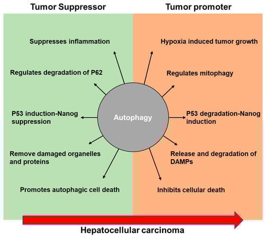 Hepatocellular carcinoma is one of the most common primary cancer and a major leading cause of death worldwide []. An estimation of 30,200 deaths is predicted this year []. The high proliferative capability of HCC cells has been linked to persistent inflammation and increased oxidative stress. Autophagy has been shown to play a dual role in cancer. Autophagy could be either tumor suppressive or tumor promoting. Here we review both the pro- and anti-tumor mechanism of autophagy that take place during the development and growth of HCC.