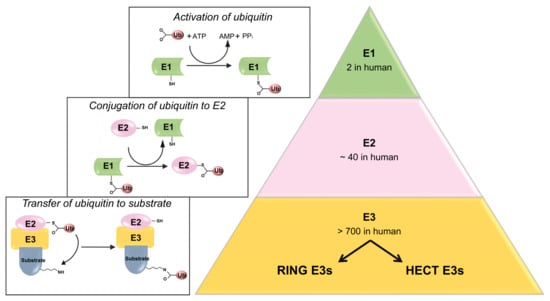 - Ye, Y.; Rape, M. Building ubiquitin chains: E2 enzymes at work. Nat. Rev. Mol. Cell Biol. 2009, 10, 755–764. [Google Scholar] [CrossRef]