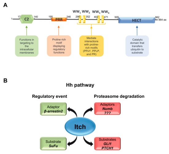 Interactions of Itch with different accessory proteins, such as NEDD4 family-interacting proteins (NDFIPs), Numb and β-arrestins, have been described to modulate its substrate recruiting capacity, subcellular localization and enzymatic activity [26,33,52,53,54] (Figure 2B). Binding of NDFIP proteins induces the enzymatic activity of Itch releasing its autoinhibitory conformation and allowing the access of other PY-containing substrates. Indeed, NDFIP1 and NDFIP2 stimulates autoubiquitylation of Itch and subsequently enhance Itch-mediated ubiquitylation of JunB and endophilin, in particular NDFIP2 [54]. Itch adaptor proteins, such as β-arrestins, can be required for Itch activity to modulate cellular localization of the target proteins. Itch-dependent ubiquitylation of TRPV4 requires β-arrestin1 to promote internalization rather than degradation of TRPV4 [55]. The role of the Itch adaptor proteins Numb and β-arrestin2 and their regulation in the Hh pathway will be extensively discuss below.