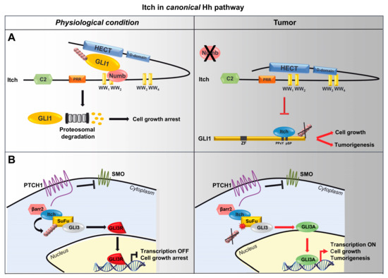 Role of Itch in canonical Hh pathway. (A) Model of the Numb/Itch-dependent regulation of GLI1 activity. Numb binds WW2 domain of Itch, releases Itch from its close-inactive conformation, thus allowing the recruitment of GLI1 and its degradation. In cancer, loss of Numb impairs this process enhancing GLI1 activity and promoting cell proliferation and tumorigenesis. (B) Model of the β-arrestin2/Itch-dependent regulation of the SuFu function. Itch, in complex with β-arrestin2, binds and ubiquitylates SuFu. This event does not lead to SuFu degradation but increases the association between SuFu and GLI3 promoting the generation of GLI3 repressor form (GLI3R) and inhibiting Hh signalling. Alterations in this mechanism, caused by SuFu mutations that make it insensitive to Itch-dependent ubiquitylation, are responsible for MB development.
