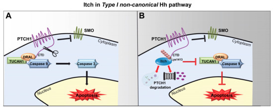 Nevertheless, although the Itch-mediated ubiquitylation at K1413 of PTCH1 is also found in response to the Hh stimuli, the absence of Itch does not prevent the degradation of PTCH1 by Hh, indicating that Itch is not able to regulate the canonical Hh pathway through the modulation of the PTCH1 basal turnover [86]. Indeed, Itch stands as a key regulator of the pro-apoptotic activity of PTCH1 in the absence of Hh in the Type I Non-Canonical Hh signalling [89], probably through a dual mechanism: the alteration of the pro-apoptotic complex, impairing the activation of Caspase 9 at the CTD of PTCH1 and the increase of internalization/degradation of PTCH1 (Figure 4).