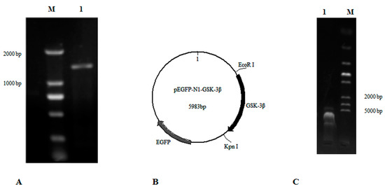 GSK-3β belongs to the PKc-like super family, and does not have transmembrane regions, based on an analysis with TRMHMM server v2.0. The open reading frame (ORF) of GSK-3β (GenBank: NM_131381.1) was analyzed and cloned with the primers GSK-3β-F1 and GSK-3β-R1 (Table 1, Figure 1A). Then the ORF of GSK-3β with the restriction enzyme sites (EcoR I and Kpn I) was cloned with the primers GSK-3β-F2 and GSK-3β-R2 (Table 1). Finally, a fragment of GSK-3β was inserted into the plasmid pEGFP-N1 by using the double-enzyme cleavage method (Beijing TransGen Biotech Co. Ltd, Beijing, China) (Figure 1B,C). This new vector was designated as pEGFP-N1-GSK-3β and transformed into E. coli DH5a for plasmid amplification.