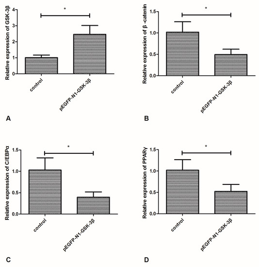 Compared to the control group, the mRNA expression of GSK-3β was significantly increased by the pEGFP-N1-GSK-3β vector in the muscle of zebrafish (Figure 2A). However, the mRNA expression of β-catenin was significantly decreased by the pEGFP-N1-GSK-3β vector (Figure 2B). Moreover, the mRNA expression of C/EBPα and PPARγ was significantly decreased by the pEGFP-N1-GSK-3β vector (Figure 2C,D).