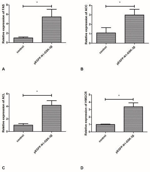Compared to the control group, the mRNA expression of FAS and ACC was significantly increased by the pEGFP-N1-GSK-3β vector in the muscle of zebrafish (Figure 3A,B). In addition, the mRNA expression of ACL and HMGCR was significantly increased by the pEGFP-N1-GSK-3β vector (Figure 3C,D).
