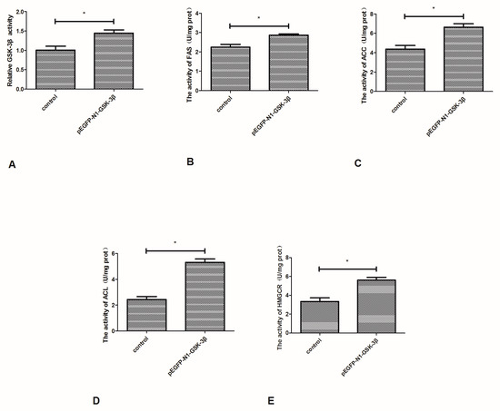 Compared to the control group, the activity of GSK-3β was significantly increased by the pEGFP-N1-GSK-3β vector in the muscle of zebrafish (Figure 4A). The activity of FAS and ACC was significantly increased by the pEGFP-N1-GSK-3β vector (Figure 4B,C). In addition, the activity of ACL and HMGCR was significantly increased by the pEGFP-N1-GSK-3β vector (Figure 4D,E).