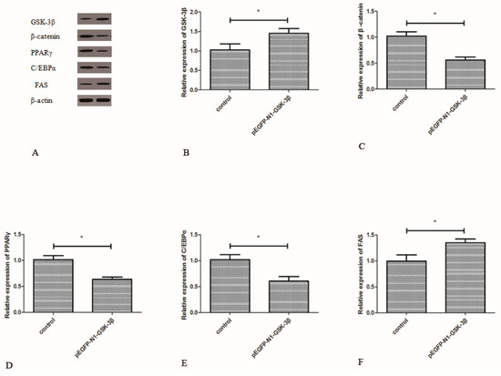 Effect of the pEGFP-N1-GSK-3β vector on the protein expression of GSK-3β, β-catenin, PPARγ, C/EBPα, and FAS in the muscle of zebrafish. (A) The protein bands; (B) GSK-3β; (C) β-catenin; (D) PPARγ; (E) C/EBPα; (F) FAS. Values are expressed as means ± s.e.m. (n = 6). Statistically significant differences are denoted by asterisk (p < 0.05).
