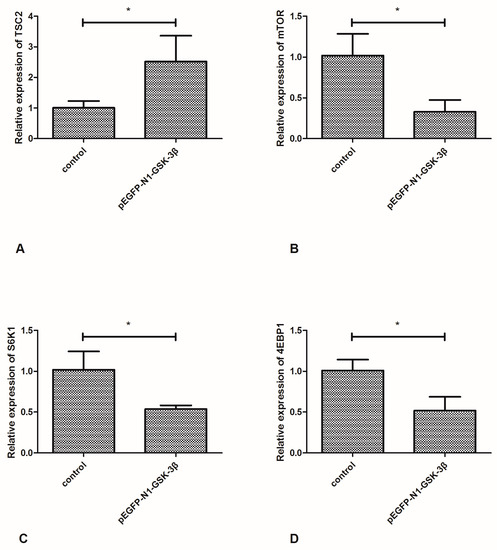 Compared to the control group, the mRNA expression of TSC2 was significantly increased by the pEGFP-N1-GSK-3β vector (Figure 6A). However, the mRNA expression of mTOR was significantly decreased by the pEGFP-N1-GSK-3β vector (Figure 6B). After GSK-3β RNA was overexpressed in the muscle, the mRNA expression of S6K1 and 4EBP1 was significantly decreased (Figure 6C,D).