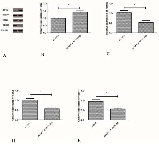 Compared to the control group, the protein expression of TSC2 was significantly increased by the pEGFP-N1-GSK-3β vector (Figure 7B). However, the protein expression of mTOR was significantly decreased by the pEGFP-N1-GSK-3β vector (Figure 7C). After GSK-3β RNA was over-expressed in the muscle, the protein expression of S6K1 and 4EBP1 was significantly decreased (Figure 7D,E).