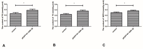 As shown in Figure 8, the content of TG and TC was significantly increased by the pEGFP-N1-GSK-3β vector (Figure 8A,B). Furthermore, the content of NEFA was significantly increased by the pEGFP-N1-GSK-3β vector in the muscle of zebrafish (Figure 8C).