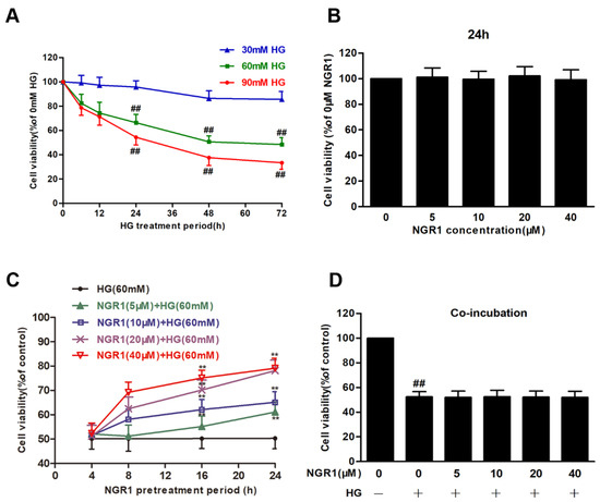 In our research, the effects of HG on rMC-1 cells were detected. rMC-1 cells treated with HG (30, 60 and 90 mM) for 12, 24, 48 and 72 h resulted in an obvious decline in cell viability in a time-dependent manner (Figure 1A). Treatment of rMC-1 cells with HG (60 mM) for 48 h reduced the cell viability to approximately 50% of the control cell viability (p < 0.01). Therefore, further experiments were performed using HG (60 mM) and a 48 h treatment period. In contrast, NGR1 had no effect on the cell viability of rMC-1 cells (Figure 1B; p > 0.05). However, NGR1 (5, 10, 20 and 40 μM) pre-treatment for 4, 8, 12 and 24 h significantly increased the cell viability of rMC-1 cells (Figure 1C; p < 0.01), followed by HG (60 mM) incubation. Unexpectedly, co-incubation of NGR1 (5, 10, 20 and 40 μM) with HG for 48 h led to almost no protection (Figure 1D; p > 0.05), which indicated that the protective function of NGR1 was conferred only when administered as a pre-treatment. In addition, to investigate whether 60 mM HG is toxic to cells due to osmotic pressure, mannitol was used as an osmotic control, and the effect of HG osmotic pressure on cells was separately investigated. No obvious toxicity was observed, and these data are provided in the Supplementary Materials (Figure S1).