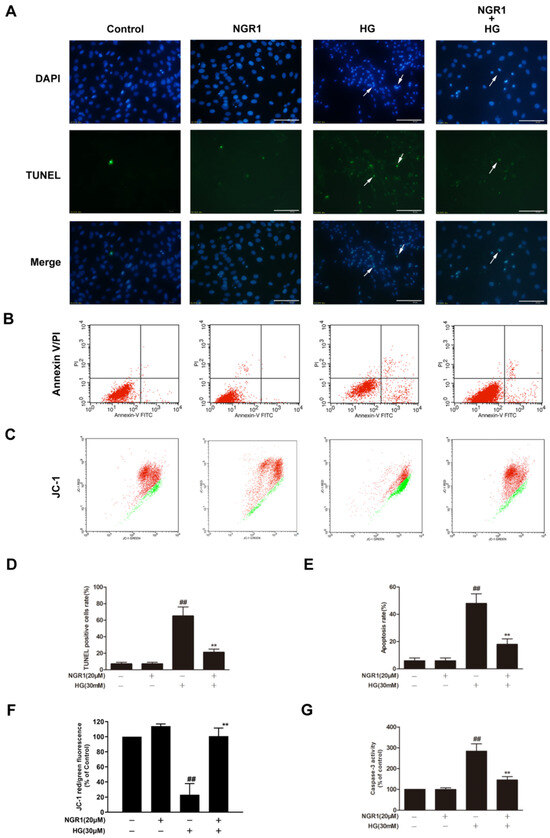 NGR1 preconditioning significantly inhibited HG-induced apoptosis in rMC-1 cells. NGR1 preconditioning attenuated HG-induced DNA fragmentation (A), Annexin V/PI double staining (B), and mitochondrial membrane depolarization (C) in rMC-1 cells. DNA fragmentation in rMC-1 cells was determined using TUNEL staining (bar = 100 μm). Apoptosis rate was quantified with Annexin V/PI double staining followed by flow cytometry analysis. Mitochondrial membrane depolarization was detected by JC-1 staining. The rate of TUNEL-positive cells (D), the quantification of Annexin V/PI double staining (E), and the percentage of JC-1 red to green fluorescence intensity (F) were quantitatively analysed, and caspase 3 activity (G) was detected by a fluorescence staining kit. The results are expressed as the means ± SD (n = 10). ## indicates a significant difference from control cells (p < 0.01). Two groups were analysed by unpaired two-tailed Student’s t tests, and multiple groups were analysed by one-way analysis of variance (ANOVA); ** indicates significant difference from HG treatment (p < 0.01). (+), treatment with HG or NGR1; (−), treatment without HG or NGR1.