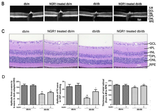 For all experiments, principles were followed to reduce the number of animals used and to minimize their suffering. The protocol was approved by the Laboratory Animal Ethics Committee of the Institute of Medicinal Plant Development, Peking Union Medical College, and conformed to the Guide for the Care and Use of Laboratory Animals (Permit Number: SYXK 2017-0020). Five-month-old db/db mice (BKS/DB−/−) and age-matched nondiabetic littermates (BKS/DB+/+, db/m) were purchased from the Animal Laboratory Center of Nanjing University. The temperature and humidity of the breeding environment were kept within the specified ranges. The mice were fed until they were 26 weeks old and then randomly assigned to the vehicle-treated db/m (n = 12), NGR1 (30 mg/kg/day)-treated db/m (n = 12), vehicle-treated db/db mice (n = 12), and NGR1 (30 mg/kg/day)-treated db/db group (n = 12). NGR1 was freshly prepared in saline and administered by gavage for 12 weeks. The vehicle-treated db/m and db/db mice were given the same amount of saline. The general health of the mice was carefully monitored, and no significant difference was found in body weight or food and water intake between the vehicle-treated and NGR1-treated groups. After being administered by gavage for 12 weeks, retinal function was assessed by detecting OCT and ERG; two days later, the mice were sacrificed for subsequent experiments.