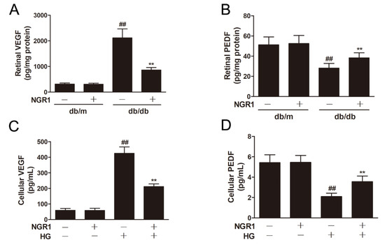 NGR1 pretreatment significantly attenuated the levels of VEGF and PEDF in vivo and in intro. The levels of VEGF (A) and PEDF (B) in retinas of db/db mice were determined by ELISA. The levels of VEGF (C) and PEDF (D) in HG-induced rMC cells were determined by ELISA. The results are expressed as the means ± SD (n = 10). Two groups were analysed by unpaired two-tailed Student’s t tests, and multiple groups were analysed by one-way analysis of variance (ANOVA); ## indicates a significant difference from control cells or db/m mice (p < 0.01). ** indicates a significant difference from the HG treatment or db/db mice (p < 0.01). (+), treatment with HG or NGR1; (−), treatment without HG or NGR1.