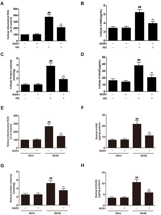 Oxidative stress plays an essential role in DR progression. Compared with control cells, HG caused a notable increase in the level of mitochondrial ROS (Figure 5A; p < 0.01) and in the levels of 4-HNE (Figure 5B; p < 0.01), protein carbonyl (Figure 5C; p < 0.01), and 8-OHdG (Figure 5D; p < 0.01) in rMC-1 cells. As expected, remarkable increases in the retinal levels of mitochondrial ROS, 4-HNE, protein carbonyl and 8-OHdG were observed in the retinas of db/db mice (Figure 5E–H; p < 0.01). However, NGR1 treatment substantially downregulated the levels of mitochondrial ROS, 4-HNE, protein carbonyl and 8-OHdG in HG-treated rMC cells and in the retinas of db/db mice (Figure 5; p < 0.01).