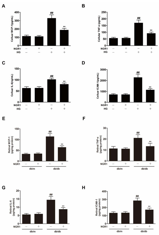 In our study, HG exposure resulted in significantly increased inflammatory factor levels (MCP-1, TNF-α, IL-6 and ICAM-1) (Figure 6A–D; p < 0.01) in rMC-1 cells. The levels of inflammatory factors (MCP-1, TNF-α, IL-6 and ICAM-1) were significantly increased in the retina of db/db mice compared with db/m mice (Figure 6E–H; p < 0.01). NGR1 treatment inhibited the expression of inflammatory cytokines in HG-treated rMC cells and in the retina of db/db mice (Figure 6; p < 0.01).