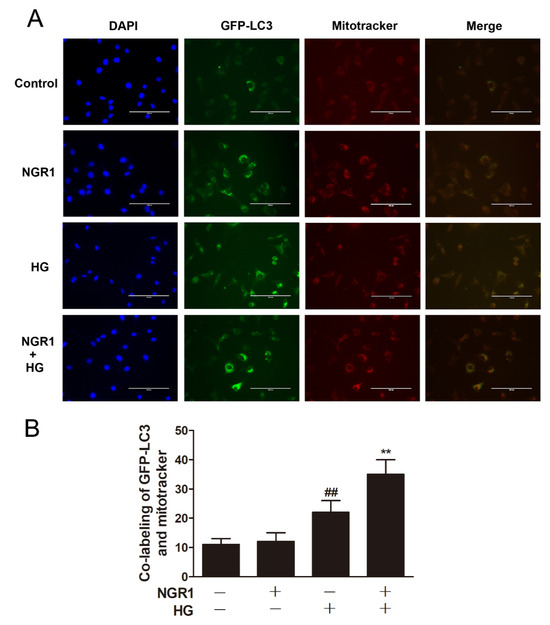 Strategies directed at enhancing mitophagy could have far-reaching beneficial effects. Therefore, we further investigated whether NGR1 affected mitophagy. As illustrated in Figure 7, compared with db/m mice, the number of mitophagy autophagosomes was elevated in the retinas of db/db mice (Figure 7, p < 0.01). However, more mitophagy autophagosomes were observed in NGR1-treated db/db mice (p < 0.01). Moreover, NGR1 enhanced mitophagy in rMC-1 cells, as revealed by the increased co-localization of GFP-LC3 puncta and MitoTracker® Red CM-H2XRos in rMC-1 cells transiently transfected with the pCMV-GFP-LC3 expression vector (Figure 8, p < 0.01).