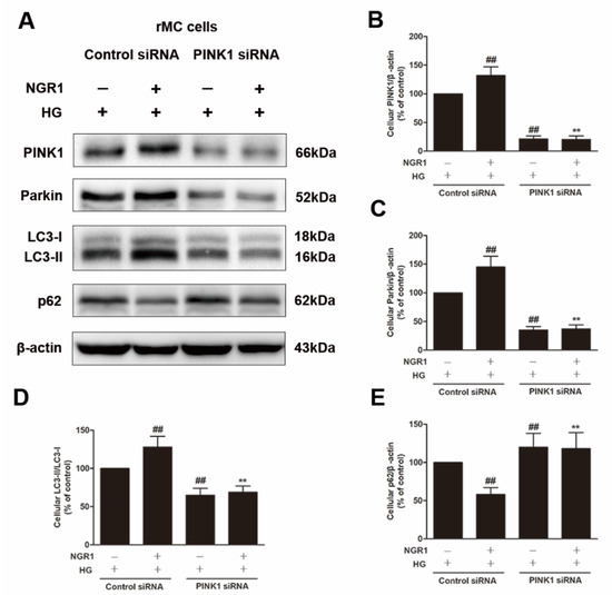 NGR1 enhanced mitophagy by activating PINK1. rMC cells were transiently transfected with PINK1 siRNA. (A) The expression of PINK1, Parkin, LC3-II/LC3-I, and p62/SQSTM1 in rMC cells was determined by Western blotting. (B) Quantitative densitometric analysis of PINK1 (C) and Parkin expression and (D) LC3-II/LC3-I ratio and (E) p62/SQSTM1 expression. The results are presented as a percentage of the control. The results are expressed as the means ± SD (n = 10). Two groups were analysed by unpaired two-tailed Student’s t tests, and multiple groups were analysed by one-way analysis of variance (ANOVA); ## indicates a significant difference from HG-treated cells transfected with control siRNA (p < 0.01). ** indicates a significant difference from cells in the NGR1+HG group. (+), treatment with HG or NGR1; (−), treatment without HG or NGR1.