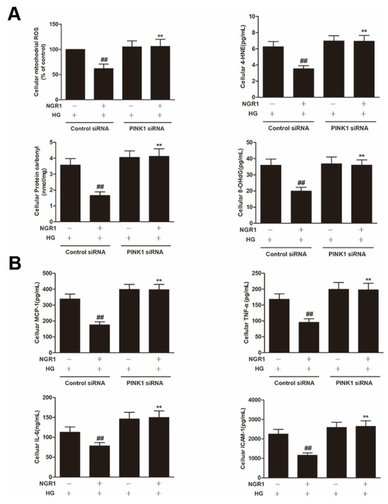 NGR1 suppressed oxidative stress inflammation by activating PINK1. rMC cells were transiently transfected with PINK1 siRNA. (A) The expression of cellular mitochondrial ROS, 4HNE, protein carbonyl and 8-OHdG. (B) The expression of the inflammatory factors MCP-1, TNF-α, IL-6 and ICAM-1. The results are expressed as the means ± SD (n = 10). Two groups were analysed by unpaired two-tailed Student’s t tests, and multiple groups were analysed by one-way analysis of variance (ANOVA); ## indicates a significant difference from HG-treated cells transfected with control siRNA (p < 0.01). ** indicates a significant difference from cells in the NGR1+HG group. (+), treatment with HG or NGR1; (−), treatment without HG or NGR1.