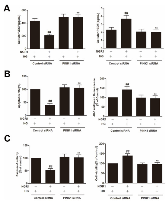 NGR1 attenuated apoptosis via activating PINK1. rMC cells were transiently transfected with PINK1 siRNA. (A) The expression of VEGF and PEDF; (B) the apoptosis rate and JC-1 ratio; (C) the caspase-3 activity and cell viability. The results are expressed as the means ± SD (n = 10). Two groups were analysed by unpaired two-tailed Student’s t tests, and multiple groups were analysed by one-way analysis of variance (ANOVA); ## indicates a significant difference from HG-treated cells transfected with control siRNA (p < 0.01). ** indicates a significant difference from cells in the NGR1+HG group. (+), treatment with HG or NGR1; (−), treatment without HG or NGR1.