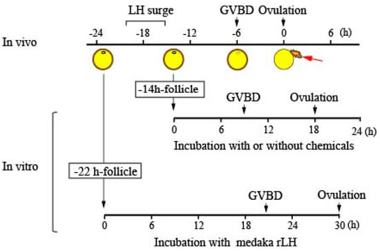 Figure 1. An outline of the in vitro culture experiments using medaka preovulatory follicles. Large follicles destined to ovulate were isolated 22 h before ovulation (−22 h-follicle) or 14 h before ovulation (−14 h-follicle). The follicles were incubated in medium containing medaka recombinant luteinizing hormone (rLH) (for the −22 h-follicle) or without LH (for the −14 h-follicle). Various chemicals were tested in culture using the −14 h-follicles to assess their effects on ovulation, oocyte maturation, as well as gene and protein expression.