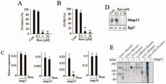 Figure 2. Effects of roscovitine on ovulation, germinal vesicle breakdown (GVBD), and gene expression of ovulation-related Mmps and its intrinsic inhibitor. (A) The −14 h-follicles were incubated in vitro with roscovitine (Rosc) at 0.5, 5, and 50 μM for 18 h, and the rate of ovulation was determined. Asterisks indicate significance at p < 0.01 (**) compared to follicles incubated without any additives (ANOVA and Dunnett’s post hoc test, N = 5). (B) GVBD rate in the follicles was determined. Follicle incubation was conducted as in (A), except that the duration of incubation was 14 h. Asterisks indicate a significance at p < 0.01 (**) compared to follicles incubated without any additives (ANOVA and Dunnett’s post hoc test, N = 5). (C) The −14 h-follicles were incubated with or without Rosc for 18 h, and the expression levels of various Mmps and timp2b were determined by real time RT-PCR. Asterisks indicate significance at p < 0.01 (**) (t-test, N = 5). (D) Follicle layers of follicles that had been incubated with or without Rosc for 18 h were analyzed for Mmp15 expression by western blotting. (E) The hydrolyzing activity of medaka recombinant Mmp15 was tested in vitro using various ECM proteins.