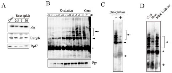 We examined the mechanism by which roscovitine inhibited the expression of the mmp15 gene in preovulatory follicles destined for ovulation. The effects of roscovitine on the follicular expression of two transcription factors, CCAAT/enhancer-binding protein β (Cebpb) and classical nuclear progestin receptor (Pgr), were examined, based on previous knowledge demonstrating that both factors play critical roles in the expression of mmp15 [13]. Treating the −14 h follicles with roscovitine had no effect on the transcription factors’ expression at the protein level (Figure 3A). Next, we examined the effect of roscovitine treatment on the phosphorylation status of Pgr. In regular SDS-PAGE of untreated follicles, Pgr synthesized in follicles was detected as a single polypeptide throughout the 24-h spawning cycle (Figure 3B, lower panel). This result is consistent with our previous observation on the temporal expression profile of Pgr in follicles destined to ovulate [13]. Pgr was present at low levels in postvitellogenic follicles, but its robust expression occurred several hours after the LH surge. On the other hand, in Phos-tag SDS-PAGE analysis, a single band corresponding to unphosphorylated Pgr was detected in the first half (-23 to -13 h) of the spawning cycle (arrowhead in Figure 3B, upper panel), but multiple slow-migrating bands appeared at later times in the cycle (arrow in Figure 3B, upper panel). Almost all bands with reduced electrophoretic mobility disappeared when the sample was treated with protein phosphatase prior to electrophoresis (Figure 3C), demonstrating that they are phosphorylated forms of Pgr. Roscovitine treatment of the follicle strongly inhibited the formation of phosphorylated Pgr, with the exception of a few bands (Figure 3D). Incubating the follicles with the MEK inhibitor resulted in no significant change compared to the control. In a separate experiment, we confirmed that the phosphorylation of a medaka MAPK protein (Erk), which corresponds to ERK42/44 in mammalian species, was almost completely blocked when the follicle incubated with the MEK inhibitor was analyzed (data not shown), indicating that the MEK inhibitor was effective in inhibiting MEK.