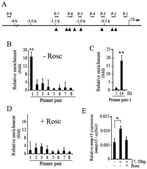Figure 4. Effect of roscovitine treatment of follicles on Pgr binding to the mmp15 promoter region. (A) For ChIP assays to examine the binding of Pgr to mmp15 promoter region, seven ChIP primer pairs (P1–P7) in the 1.5 kb upstream region of the transcription start site (indicated as +1) of the mmp15 gene and another primer pair (P8 as a negative control) were prepared. Putative progestin receptor elements (PREs) in the region are indicated by boxes. (B) The −14 h-follicles were incubated in vitro without roscovitine (Rosc) for 14 h, and the resulting follicles were used for ChIP assays and amplified with primer pairs P1 to P8. The sheared DNA immunoprecipitated with anti-medaka Pgr antibody was analyzed by real-time RT-PCR. Asterisks indicate a significant difference at p < 0.01 (**) compared to the negative control (ANOVA and Dunnett’s post hoc test, N = 4). (C) The −14 h-follicles were incubated in vitro for 7 h or 14 h, and the resulting follicles were used for ChIP assays using primer pair P1. The sheared DNA immunoprecipitated with anti-medaka Pgr antibody was analyzed by real-time RT-PCR. Asterisks indicate a significant difference at p < 0.01 (**) compared with the 7 h-incubated follicles (t-test, N = 4). (D) The −14 h-follicles were incubated in vitro with Rosc (50 μM) for 14 h, and the resulting follicles were used in ChIP assays as in (B). (E) OLHNI-2 cells stably expressing medaka Pgr were cultured alone, in the presence of 17,20βP (100nM), or in the presence of both 17,20βP and Rosc. After culturing for 24 h, the expression levels of mmp15 were examined by real-time RT-PCR. Asterisks indicate a significant difference at p < 0.05 (*) (ANOVA and Dunnett’s post hoc test, N = 4).