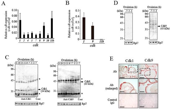 Figure 5. Expression of Cdks in the medaka ovary. (A) Relative expression levels of cdk transcripts were determined by real-time RT-PCR using total RNAs isolated from follicle layers of preovulatory follicles isolated 6 h before ovulation. (B) Relative expression levels of cdk1, cdk9, and cdk11b transcripts were determined by real-time RT-PCR using total RNAs from granulosa cells isolated from the −6 h-follicles. (C) Expression of Cdk1 (left panel) and Cdk9 proteins (right panel) in the preovulatory follicles were analyzed. Extracts from follicles were prepared at various time points in the 24 h spawning cycle and immunoprecipitated with specific Cdk1 and Cdk9 antibodies. The immunoprecipitated materials were then analyzed by western blotting using the same antibodies. Asterisks indicate the bands corresponding to the antibody used for immunoprecipitation. As control, the −7 h-follicle extracts were immunoprecipitated with normal IgG. (D) Expression of Cdk1 (left panel) and Cdk9 proteins (right panel) in follicle layer extracts were analyzed. The extracts were prepared using the follicle layers of follicles isolated at 7, 5, or 3 h before ovulation and examined by western blotting using specific antibodies. (E) Immunohistochemical analyses were performed in the sections of spawning fish ovaries isolated 15 h before ovulation. Cdk1 (left, upper and middle panels) and Cdk9 (right, upper and middle panels) were stained using the purified antibodies. The area indicated by a box in the upper panels is shown at a higher magnification in the middle panels. Normal IgG was used as a control (lower panels). Bars represent 200 μm in the upper and lower four panels, and 100 μm in the middle two panels.