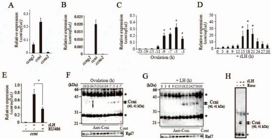 Figure 6. Expression of cyclins in the medaka ovary. (A) Relative expression levels of ccn transcripts were determined by real-time RT-PCR using total RNAs derived from follicle layers of preovulatory follicles isolated 6 h before ovulation. (B) Relative expression levels of ccng2, ccni, and ccne2 transcripts were determined by real-time RT-PCR using total RNAs of granulosa cells isolated from the −6 h-follicles. (C) Total RNAs were prepared from the follicles at various time points in the 24 h spawning cycle and were used for real-time RT-PCR of ccni mRNA. The expression levels were normalized to those of eef1a1. Asterisks indicate a significant difference at p < 0.05 (*) (Kruskal–Wallis test, N = 5–7). (D) The −22 h-follicles were incubated in vitro with or without recombinant medaka LH (100 μg/mL). At various time points of incubation, total RNAs were prepared from follicles and used for real-time RT-PCR of ccni mRNA. The expression levels wre normalized to those of eef1a1 and expressed as the fold change compared to levels of 0 h follicles. Asterisks indicate a significant difference at p < 0.05 (*) (Kruskal–Wallis test, N = 4–5). (E) The −22 h-follicles were incubated with recombinant medaka LH (100 μg/mL) with or without RU-486 (100 μM). After 18 h of incubation, total RNA was extracted from the follicles and used for real-time RT-PCR analysis of ccni mRNA. The expression levels were normalized to those of eef1a1. An asterisk indicates a significant difference at p < 0.05 (*) (t-test, N = 4). (F) Expression of Ccni protein in the preovulatory follicles was analyzed. Extracts of the follicles were prepared at various time points in the 24 h spawning cycle and immunoprecipitated using the specific Ccni antibody. The immunoprecipitated materials were then analyzed by western blotting using the same antibody. Asterisks indicate the band corresponding to the antibody used for immunoprecipitation. As a control, the −7 h-follicle extracts were immunoprecipitated with normal IgG. (G) The −22 h-follicles were incubated with medaka rLH (100 μg/mL). At various time points of incubation, follicle extracts were prepared and immunoprecipitated with the Ccni antibody. The immunoprecipitated materials were then analyzed by western blotting using the same antibody. Asterisks indicate the band corresponding to the antibody used for immunoprecipitation. As a control, the follicles that had been incubated with medaka rLH for 30 h were immunoprecipitated with normal IgG. (H) The −22 h-follicles were incubated with medaka rLH (100 μg/mL) with or without roscovitine (Rosc; 50 μM). After 18 h of incubation, the follicular extracts were immunoprecipitated using the Ccni antibody, and the resultant materials were analyzed by western blotting using the same antibody. An asterisk indicates the bands corresponding to the antibody used for immunoprecipitation.