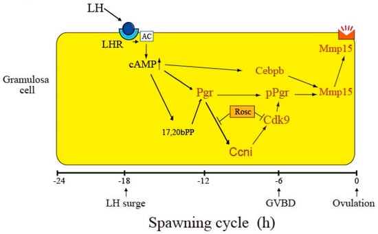 Based on the present observations together with our previous findings [6,13], we propose a schematic model for the role of Ccni/Cdk9 in the pathway leading to mmp15/Mmp15 expression after the LH surge in follicles (Figure 8). In this model, we focus on the events occurring in granulosa cells, because these cells have been documented to play a major role in fish ovulation [24]. Roscovitine’s effects are also shown in this model. A variety of ovulatory reactions, including the activation of many ovulation-related genes, are evoked in cells expressing the LH receptor in response to the surge of LH, which occurs approximately 18 h before ovulation in the 24-h spawning cycle [14]. Activation of the LH receptor by the LH surge immediately causes an increase in the intracellular cAMP concentration, which leads to the activation of Pgr. Pgr, thus synthesized, would then undergo phosphorylation at multiple sites, mainly via Cdk9. Cdk9, which is constitutively expressed in granulosa cells, should be activated by Ccni. Ccni is also induced in granulosa cells in response to LH stimulation. Our current data suggest that the expression of Ccni is driven by the 17,20βP-activated transcription factor Pgr, and that Pgr-dependent Ccni expression is initiated approximately 9 h before ovulation. Activated Cdk9 complexed with Ccni is capable of phosphorylating Pgr at various sites. The increase in phosphorylated Pgr levels begins at 9 h before ovulation in the granulosa cells of ovulating follicles, and such a situation lasts thereafter until the time of ovulation. Another transcription factor, Cebpb, which is also induced in an LH-dependent manner, is synthesized in granulosa cells of the follicle [13]. At several hours preceding follicle rupture, both phosphorylated Pgr and Cebpb bind to the promoter region of the mmp15 gene for activation. The resulting translation product, Mmp15, is eventually expressed on the surface of granulosa cells. To substantiate the above hypothesis, further analyses using siRNA and knockout experiments targeting the ccni and cdk9 genes are necessary.